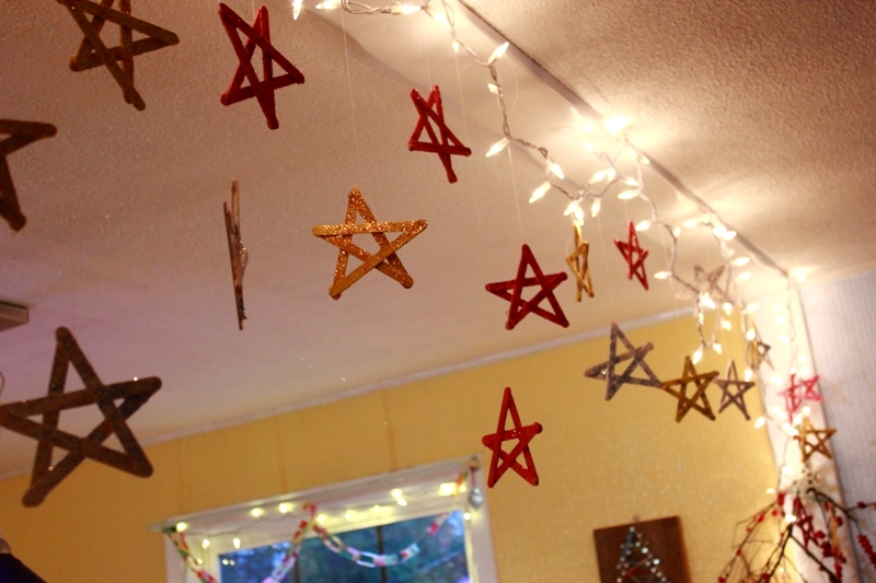 obyčajné paličky s nanukov natrieme lepidlom a obsypeme trblietkami. tiež možeme zmiešať trblietky priamos tekutým lepidlom a rovno malovať na paličky, tie potom prilepíme do tvaru hvizdy