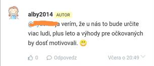 @alby2014 v poriadku, a tym sa vraciame k tej prvej mojej otazke. Ak sa "obetujem" pre kolektivnu imunitu (t.j. pre tych, co sa ockovat nemozu, resp. nevytvoria si imunitu), co ja z toho mam okrem dobreho pocitu? Niezeby som nemala radost z dobreho skutku pre blaho ludstva, ale to mi ucty nezaplati, deti nenakrmi a tiez by som sa rada pohybovala ako slobodny clovek, napr. cez okres ist pozriet cloveka, na ktorom mi zalezi (ked uz ti vnutri okresu sa bez kontroly a sankcii mozu stretavat do lubovole a nikto im nic nemoze). To si snad aspon zasluzim za ten prispevok ku kolektivnej imunite, ktory ma vacsi vyznam pre ostatnych ako mozno pre mna samotnu, ci? Takze znova - ak nemam mat ziadnu vacsiu slobodu, prenecham budovanie imunity ostatnym.