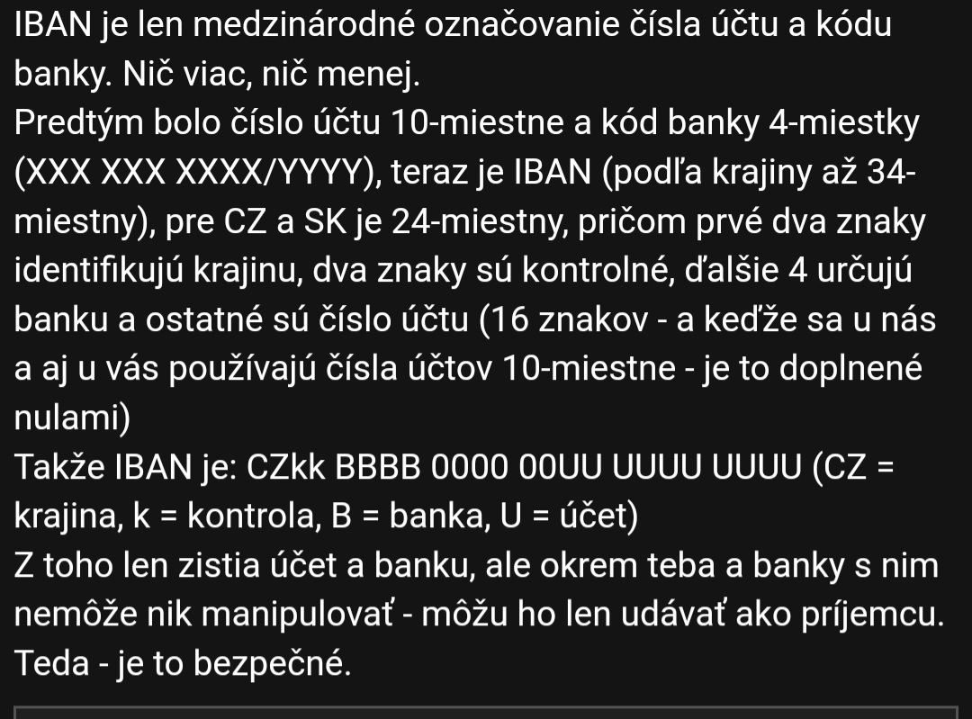 Ale to sa nedá na základe ibanu nijako zneužiť 😀. To nie sú údaje z karty ani občiansky. Maximálne jej na ten účet môžu poslať peniaze 😀.