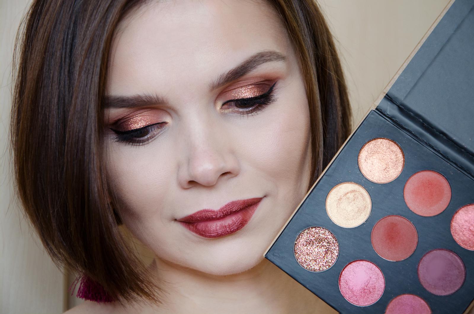 A tu je moje líčenie na vianočný večierok - použila som tiene z paletky Jingle All The Way - v ohybe matný terakotový a slivkový a na pohyblivom viečku medený na ktorý som aplikovala aj gliter. Vnútorný kútik som rozjasnila najsvetlejším zlatistým odtieňom z paletky a celé líčenie zakončila čiernou tekutou linkou Essence Liquid Ink Waterproof.