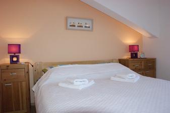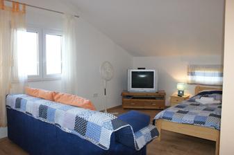 Apartmán na prvom poschodí rodinného dumu,. spálňa s manželskou posteľou a kuchyňa s obývačkou (posteľ plus rozťahovací gauč), balkón a dvore so záhradou. posledný voľný termín od 28.08.-05.09.14 a cena je LEN 48 EUR ZA APARTMÁN ZA NOC!