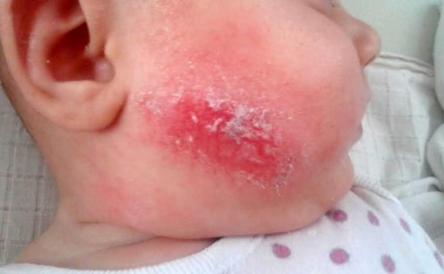 Toto je ekzem, excipial ULL na tvar moze ist, len treba dat pozor na oci, kludne mozte premastovat aj obyc. modrou indulonou. Pridat aspon na noc Fenistil tolko kvapiek kolko ma dieta kg. A bezalergenova dieta, ak je dieta dojcene tak to plati aj pre matku. Planovat kozne vys. a alergologicke vys.