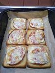 Na plech dam papier na pecenie, poukladam toustovy chleba, trosku potriem maslom, platok sunky, nastruhany syr a sup s tym do rury na 250 cca 7-8 minut. Chlebik chrumkavy, syr rozteceny a upeceny. A priprava vsehovsudy 10 minut.