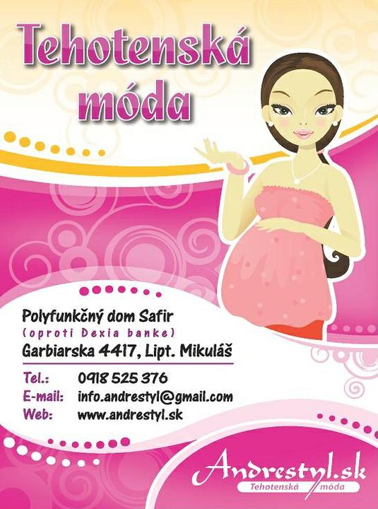 Tehotenske nohavice elegantne ale aj riflové, menšestrové....3/4, tehotenské sukne a šaty, tehotenske blúzky a tričká, tehotenské legíny a pančušky, materske spodne prádlo, podprsenky na kojenie, podbruskové a nadbruskové nohavičky, pyžamá na kojenie, podporné pásy na bruško, tehotenské kabátiy a plášte…..www.andrestyl.sk