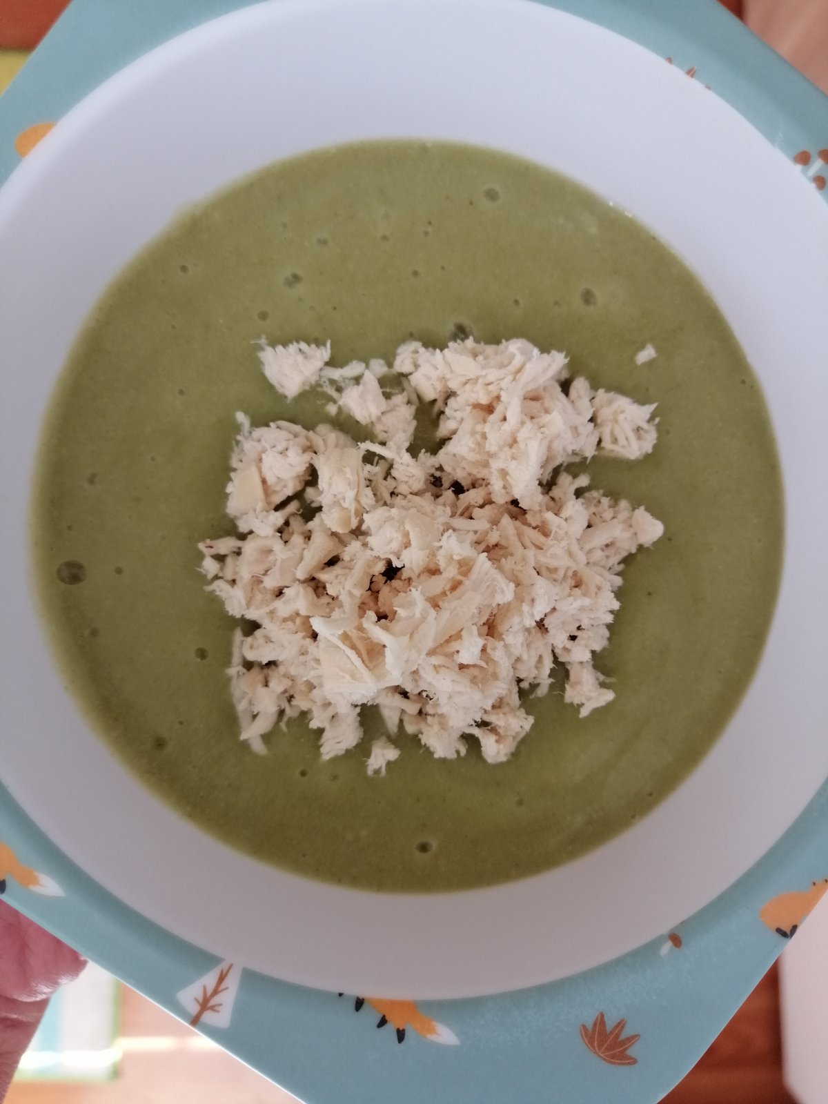 Kuracie prsia na póre s brokolicou. Mäsko som podusila na troche vody, pridala kúsok brokolice, póru, ryžu a uvarila do mäkka. Brokolicu, pór a ryžu som pomixovala a mäsko nakrájala na drobné kúsky. Vhodné 6+