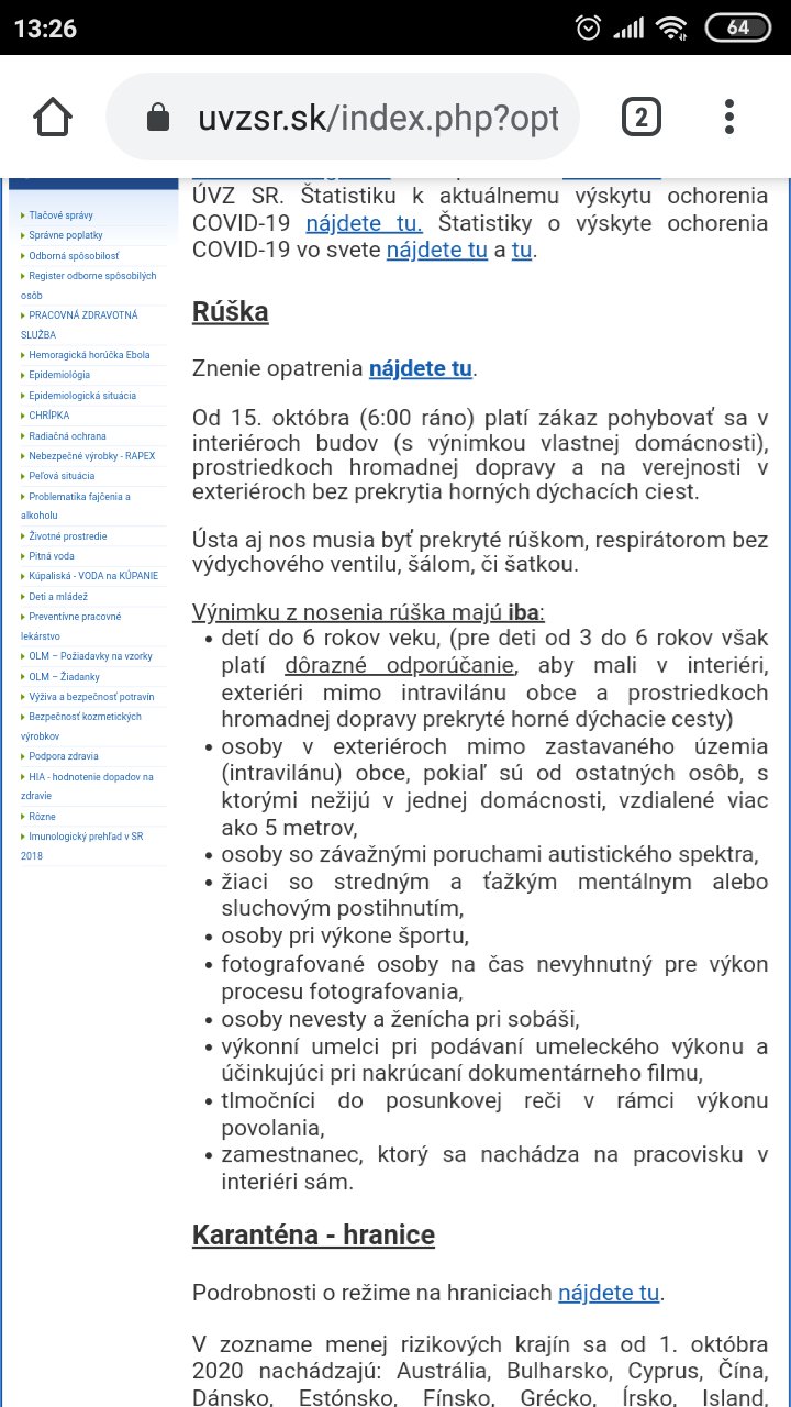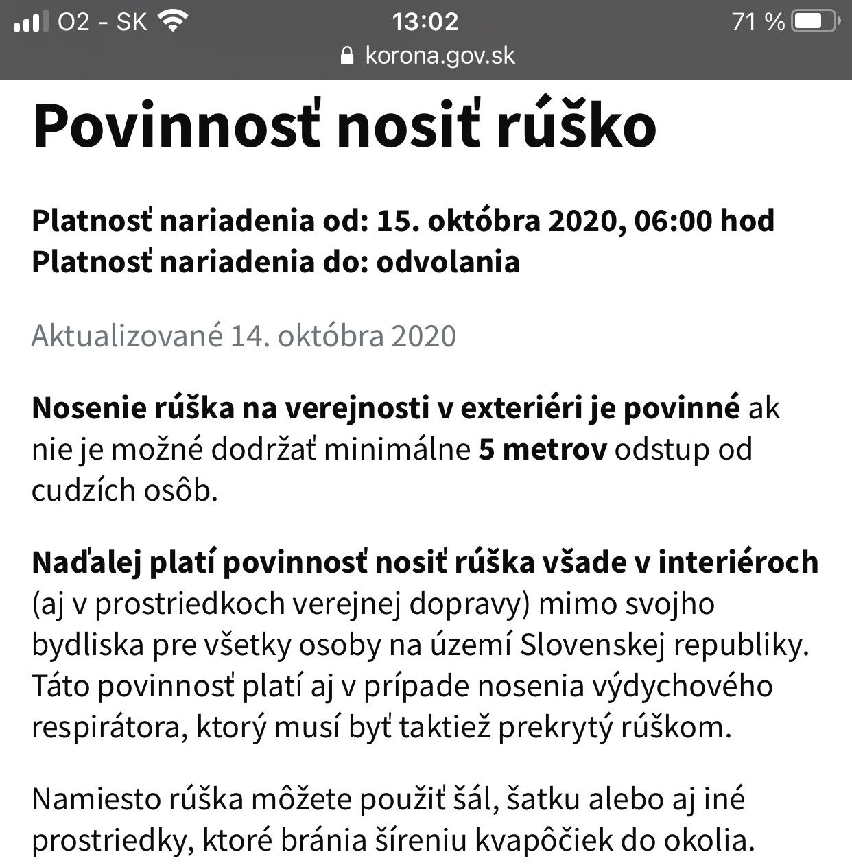 @jenny257 v tom prvom odseku je to predsa jasne napísané, že to platí aj exteriéri. Nikde nie je uvedená výnimka keď okolo teba široko ďaleko nik nie je. Výnimka jedine mimo zastavané územie. A teda všetky aktuálne platné nariadenia sú vždy dostupné na ruvz, čiže stačí si to tam vyhľadať.