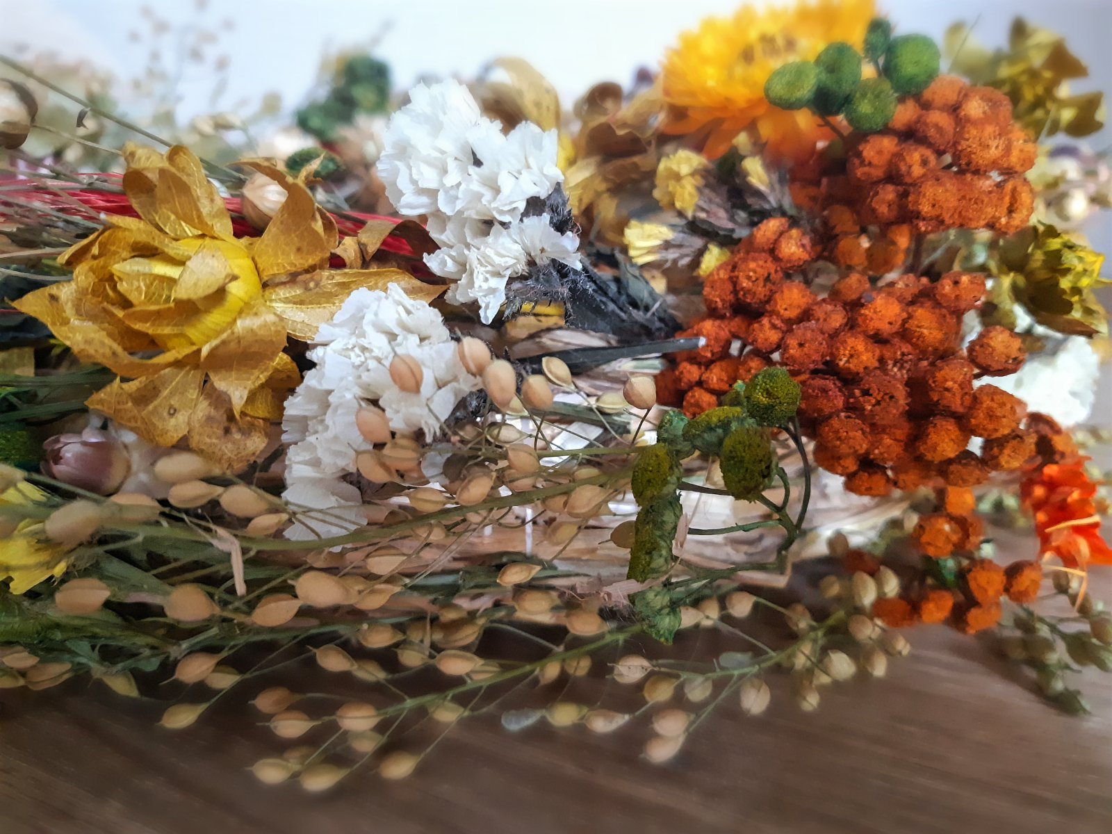 ešte jeden jesenný - venček je plný zemitých farieb sušených kvetov. Podklad je slama, je krehký, na zavesenie na dvere, iba tak na stôl, iba v interiéri.