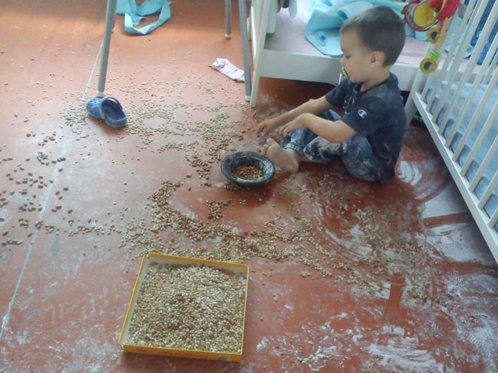 Junovky 2013 boli asi akcne,sestra ma presne takeho isteho,radost z hovienka este neobjavil,ale zato sa jej statocne vycikal do pracky,vyliezol hore na linku,vysypal komplet muky,cukor,cestoviny a vsetko,co nasiel,okraslil podlahu fixkami a mnoho inych kreativnych zalezitosti,ale on je certik aj v skolke 😂😎