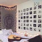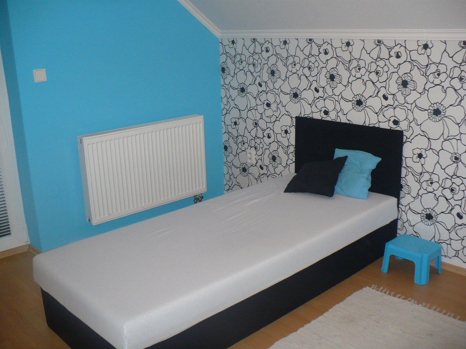 dcéra vo veku 10 a viac rokov mala bledunko fialové steny a biely nábytok. Časom lepila plagáty, keď sa ich konečne dokázala vzdať, tak sme na jednu stenu dali čb tapetu a zvyšné steny sme namaľovali na tyrkysovo. Teraz má stále tú tapetu, steny dymovej bledunko modrej farby, ale posteľ sa vymenila na dvojlôžko, pribudla pekná komoda do série k posteli, väčší šatník, frajer 😀 Na stenách rámiky s fotkami.