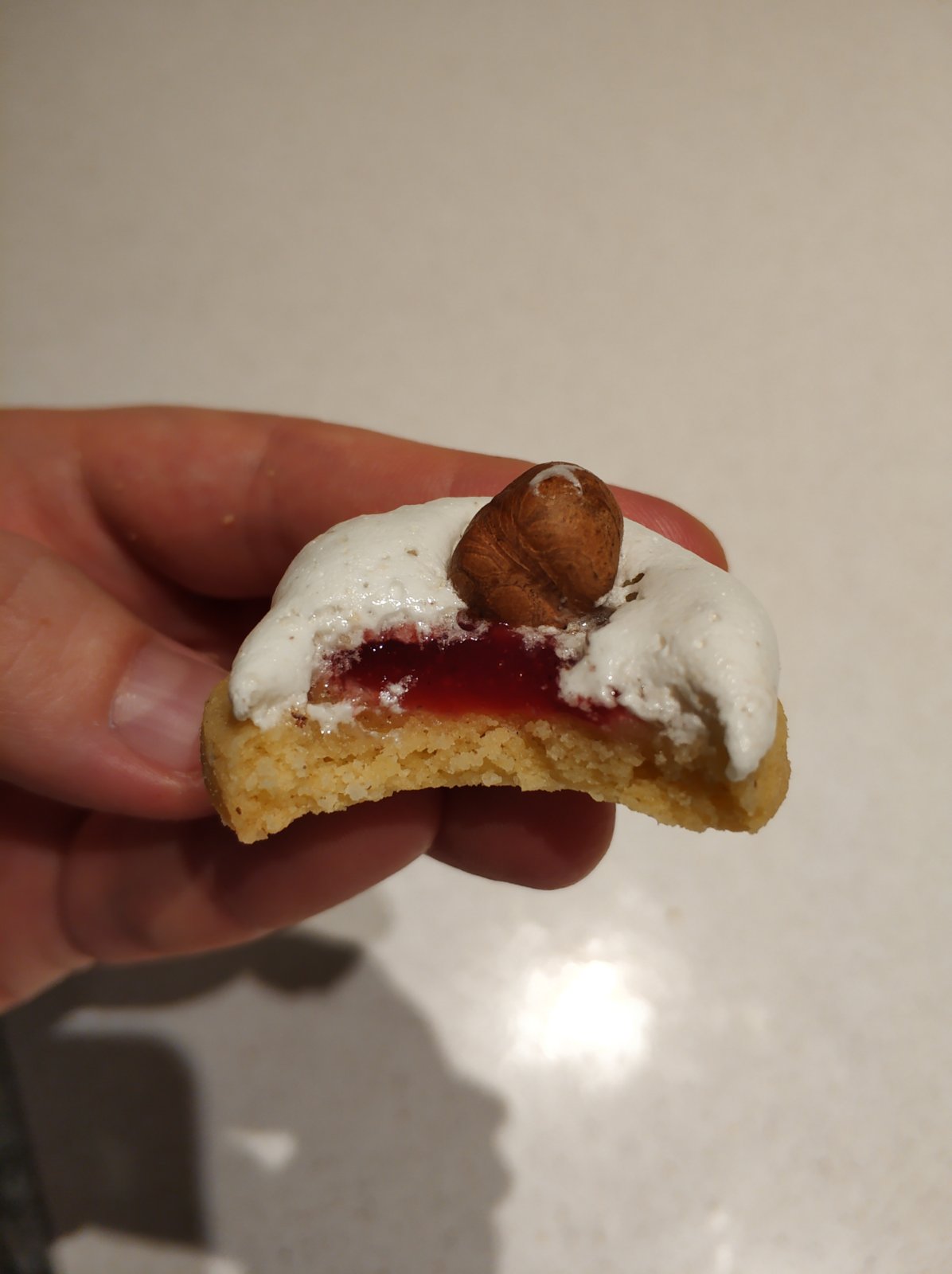 @simeab jagerske gombíky sa vraj volajú 👍 maslová sušienka, v strede ríbezľový džem a orechový sneh a orech hore.