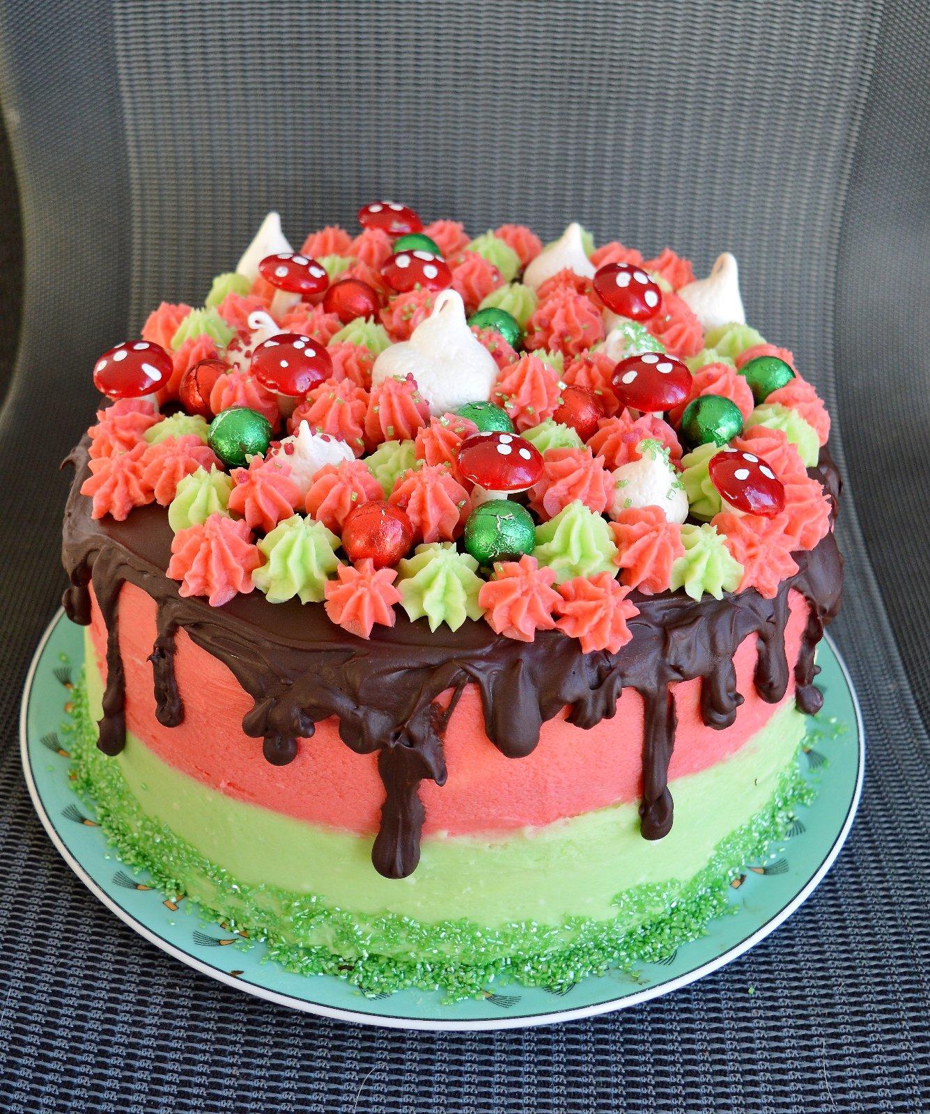 @angelika4 gulky coko su kupene a aj tie hribiky, inak su tam len merinque cookies tie biele to mas len bielko s cukrom a trochu limetkovej aromy a zvysok cervene a zelene su len zvysky masloveho kremu co je po stranach do sacika s tou pipetou ci ako sa to prelozi na kvety a povytlacat. Par trblietok a hotovo