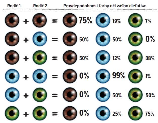 @anjelicek26 je to presne ako pise @neanonymna . Svokor má modré oči,tak môj manžel má od neho modré a od svokry hnedé. Keďže je hnedá dominantná, tak manžel má hnedé oči,ale trom svojim deťom odovzdal gen modrých očí a keďže obaja moji rodičia majú modré oči,tak ja viem odovzdať len modré.