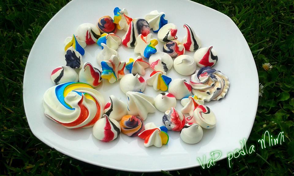 @luliu 4 vajecne bielka predslahat, v rure na 200g zohriat krystalovy cukor, vybrat a okamzite zaslahavat do snehu po lyzickach... vznikne nadychana lepkava masa... tu plnis do zdobiaceho sacku, kde zvnutra namalujes potravinovou farbou pruzky... potom vyjdu taketo farebne... je to cool a uplne lahke... piect na 95-100 stupnov asi 1,5h na fukari v polke procesu otocit...