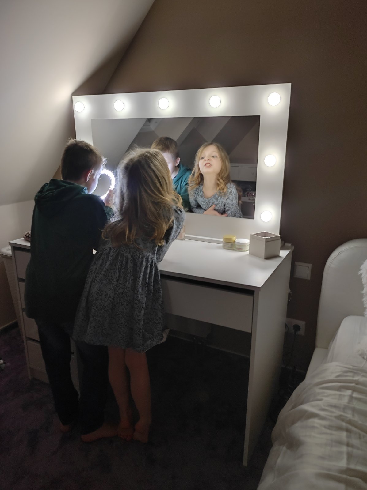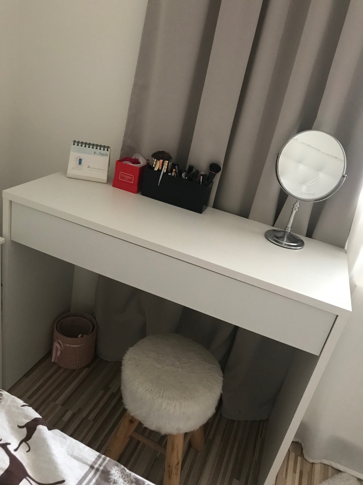 ja mám takýto, jeden šuflik, a uplne mi stači, ešte polku z tej kozmetiky, čo v nom mám nepouživam. Zrkadielko mám na nom len také menšie položené, lebo ja musim mať zrkadlo blizko tvare, ked sa líčim a tie, čo bývaju na tých kozmetických stolikoch priamo zabudované, tak k tým by som sa musela priliš naklanat, preto mám bez zrkadla.