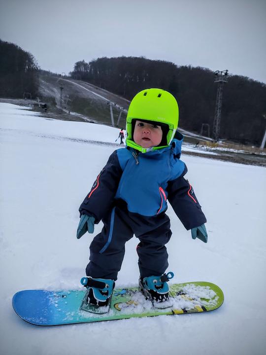 Dnes zahajil Max svoju prvu sezonu na snowboarde.