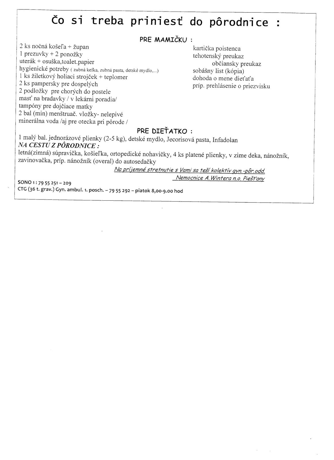 Dnes, na CTG pásoch som dostala ZOZNAM do pôrodnice. S prípisom: Na príjemné stretnutie s Vami sa teší kolektív gyn.-pôr.odd. Nemocnice A.Wintera n.o. Piešťany. Ja sa skôr teším na ten deň, keď už s batôžkom budem odchádzať domov, kde na nás už netrpezlivo bude čakať 16r.pomocníčka a samozrejme náš tato a určite sa pridá babka, dedko i krstná