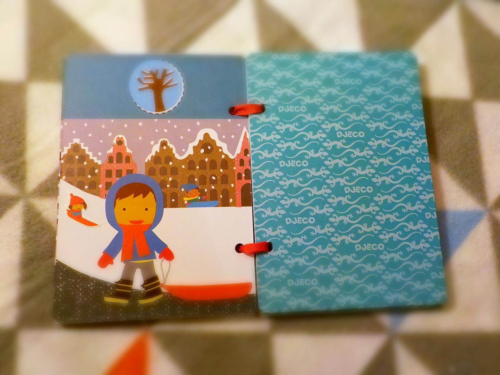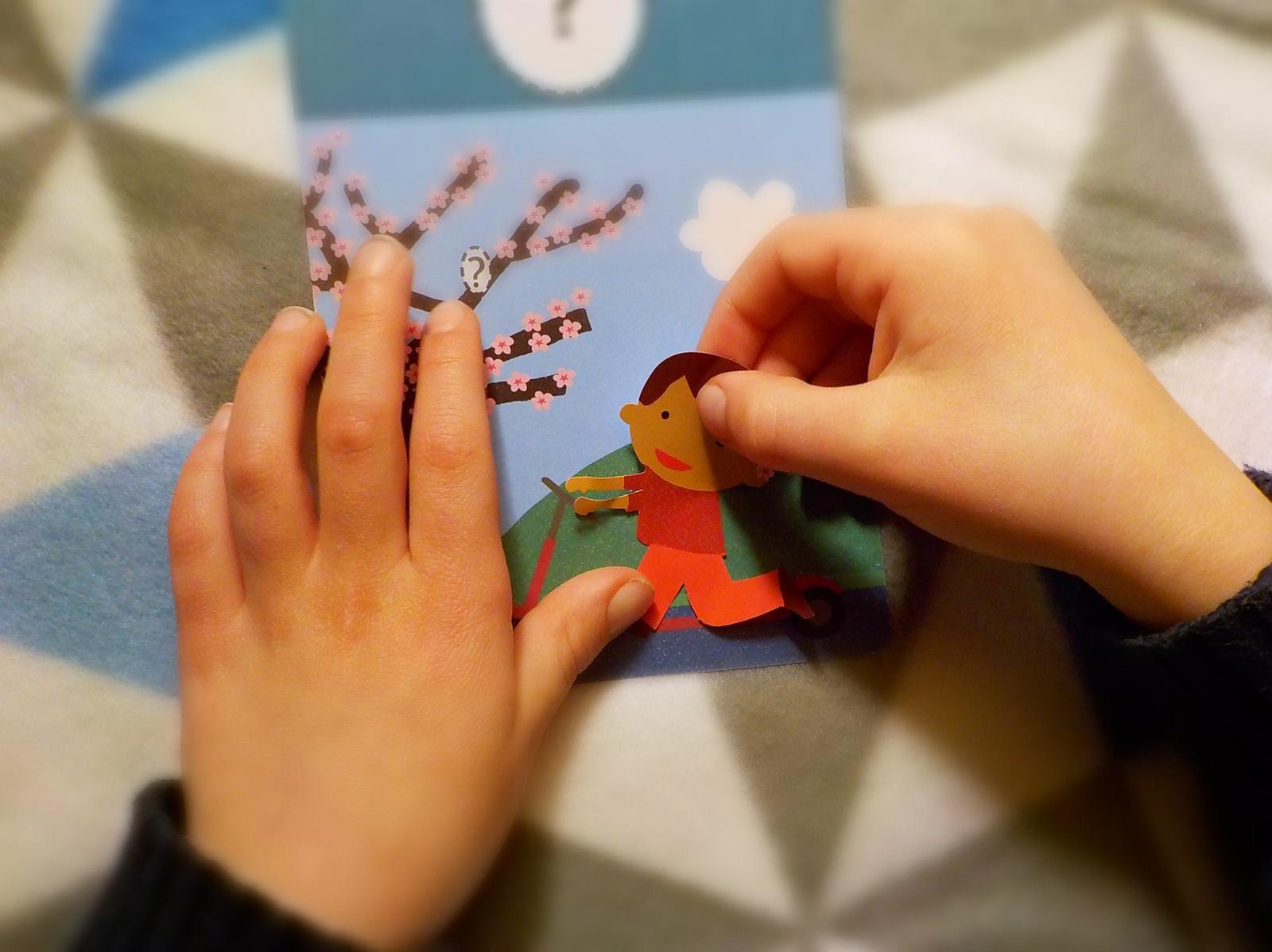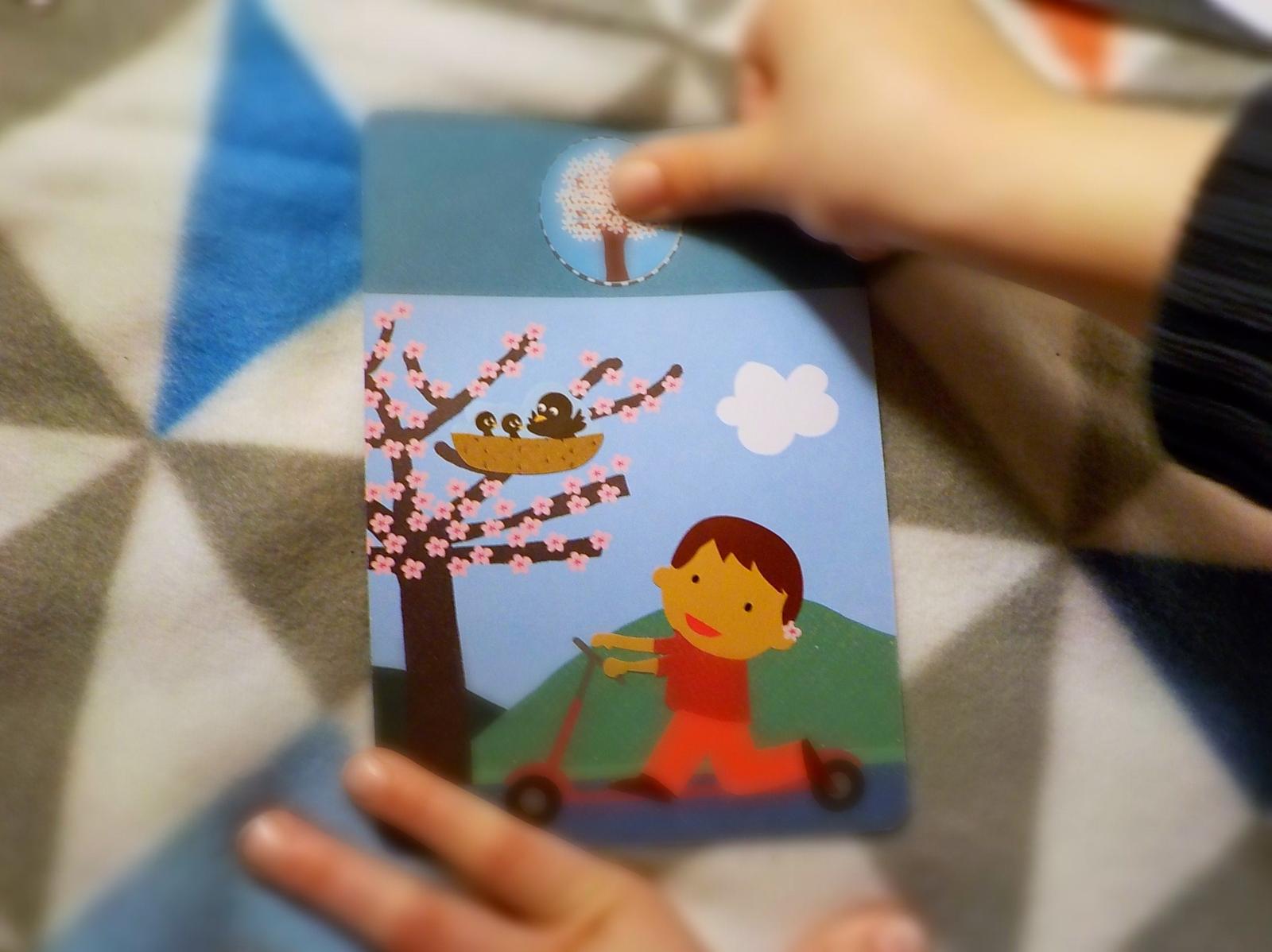 Na každú kartičku dieťa nalepí 3 druhy nálepiek: strom, ktorý značí ročné obdobie, postavičku chlapčeka a predmet, ktoré typicky dopĺňajú scénu.