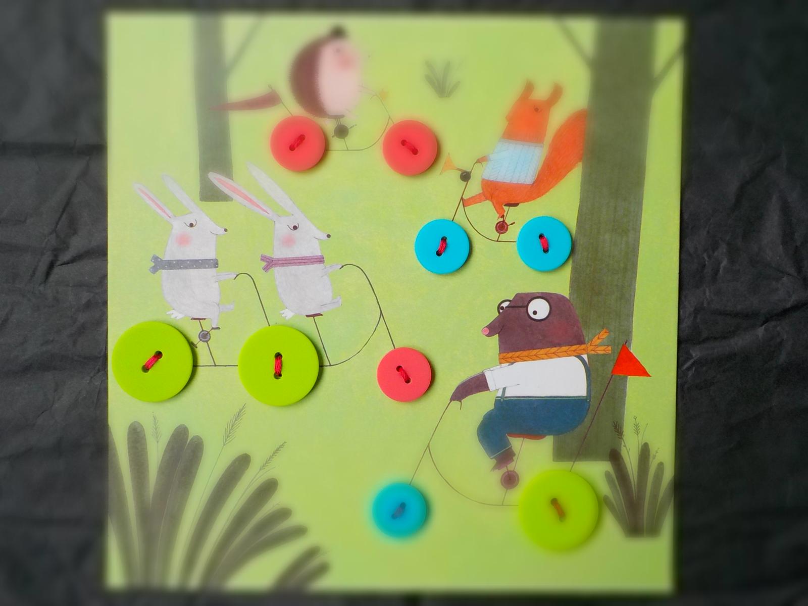 Pre menšie deti je obrázok lesnej bicyklovačky azda najvhodnejší, pretože sa naň prišívajú iba okrúhle a dostatočne veľké jednofarebné gombíky. Predtým než sa pozriete do návodu, ako majú byť gombíky rozmiestnené, môžete dieťa vyzvať, aby rozmiestnilo gombíky podľa vlastnej predstavy. Potom môžete porovnať jeho kompozíciu s návodom.