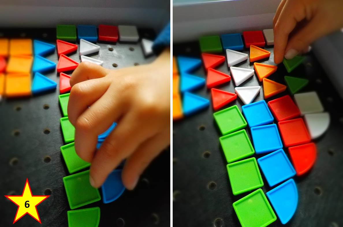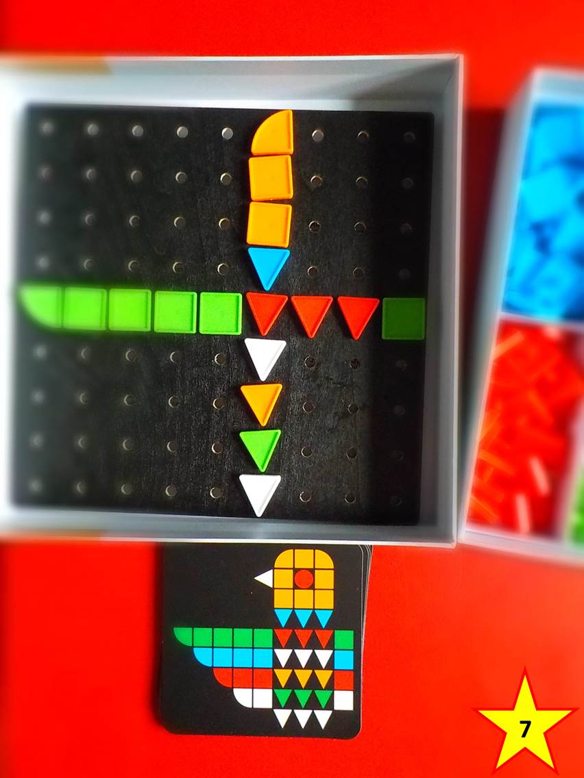 Pri Mozaike s kontrastným čiernym pozadím (Mosaïco), určenej pre deti od 4 rokov, sa vyžaduje viac samostatnosti, pretože tu sa dieliky vsádzajú priamo, bez predlohovej podložky do dosky. Dieťa má k dispozícii 28 kartičiek s predlohami a ploché dieliky geometrických tvarov, v škatuli uložené do priehradok podľa farieb (obr. 5).