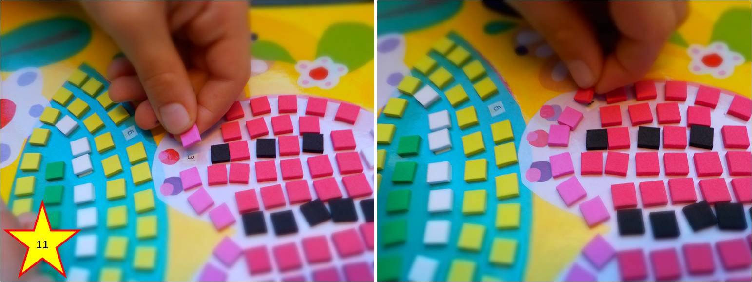 Iný spôsob vytvárania mozaiky predstavujú mozaiky s penovými lepiacimi dielikmi, ktoré sa lepia na predlohu podľa čísel. Určené sú pre deti od 4 rokov a vybrať si môžete spomedzi viacerých motívov. Napr. Mozaika Vtáčik a lienka (obr. 10) obsahuje predlohu s motívom vtáčika a predlohu s motívom lienky, farebné penové lepiace štvorčeky a brožúrku s číselným kódom pre farby.