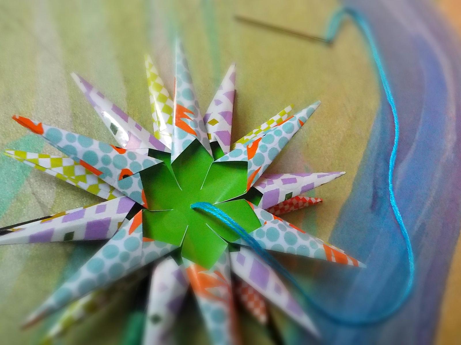 ... a s predtlačeným vzorom, ktorý budete vystrihovať, z druhej strany. Je 12 listov s veľkou hviezdou – z tých všetkých bude jedna veľká hviezdna guľa.