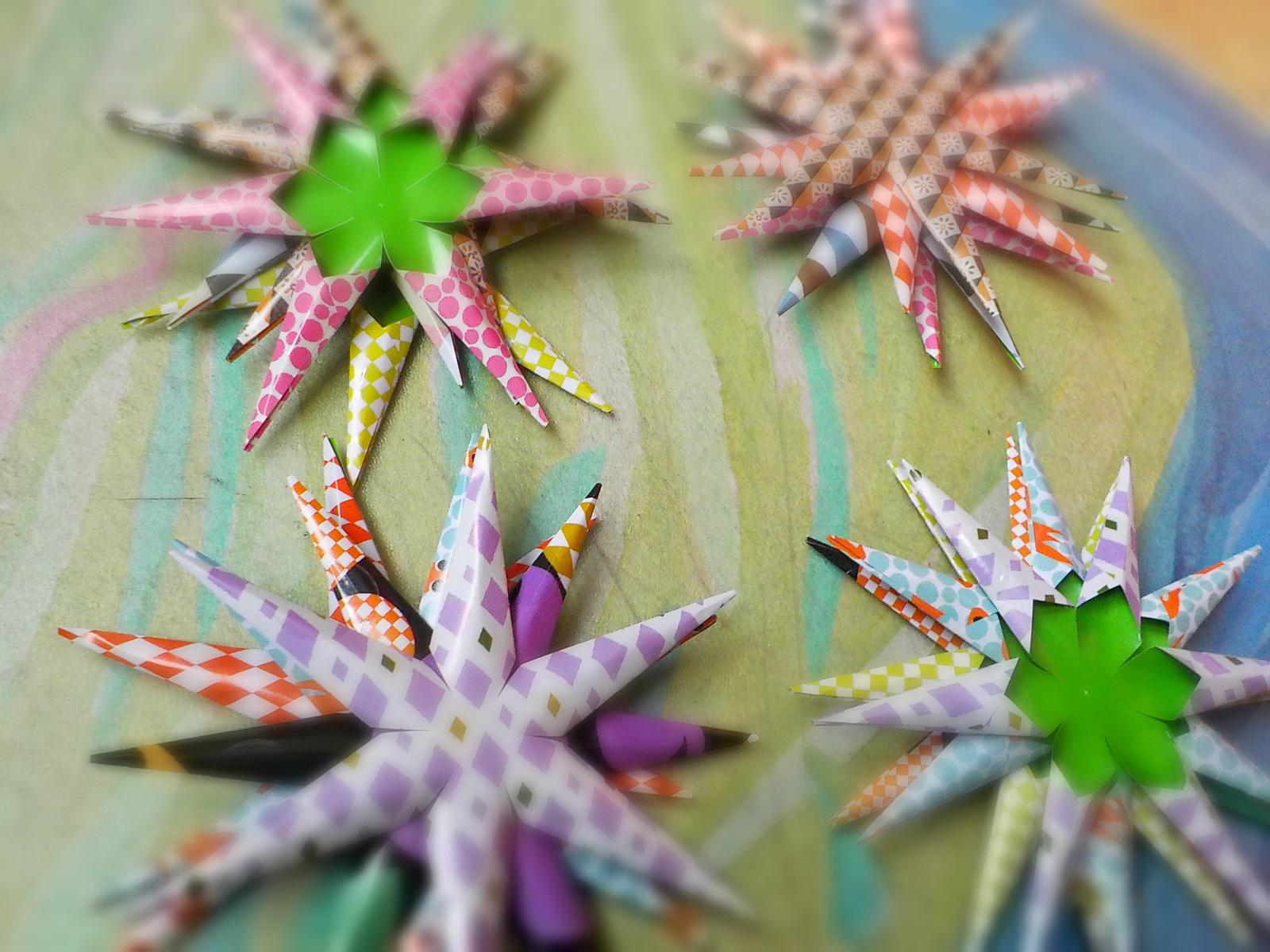 Hviezdy vystrihnete, papier zastrihnete smerom ku stredu podľa vyznačených línií a podľa prerušovaných čiar papier preložíte.