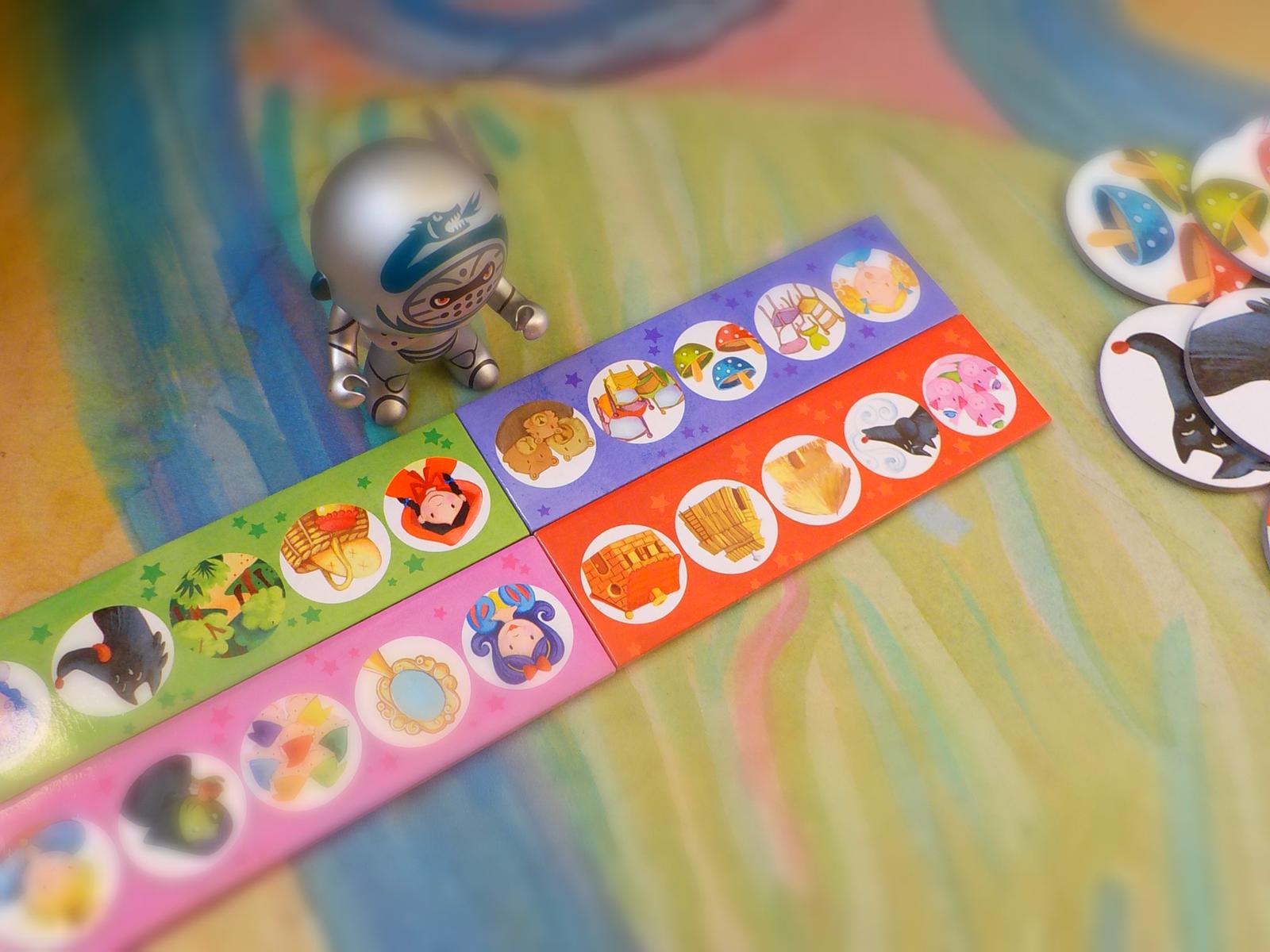 Hra obsahuje 4 dejové kartičky a 40 dielikov (ku každej kartičke 10 dielikov, 5 párov). Na každej kartičke je vyobrazených 5 základných významových zložiek rozprávky, a to rozprávok Zlatovláska a tri medvede (Goldilocks and the three bears), Červená čiapočka, Tri prasiatka, Snehulienka.