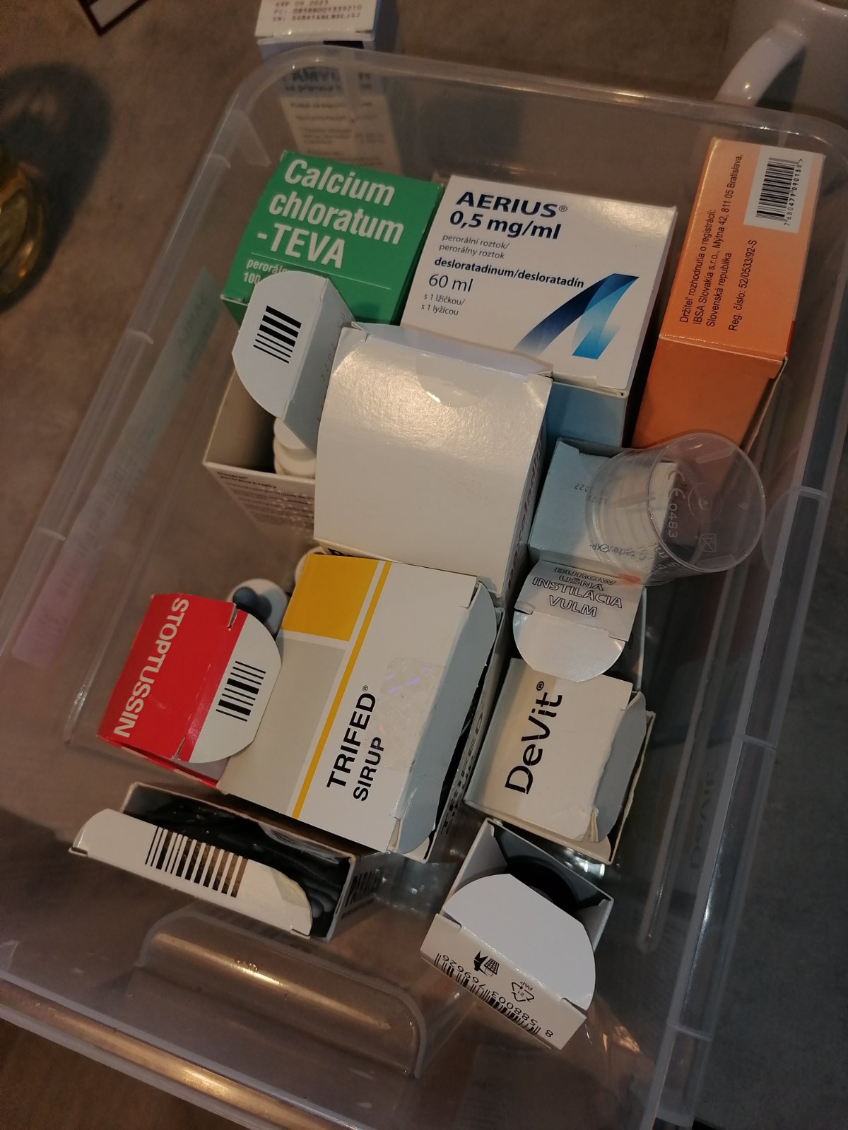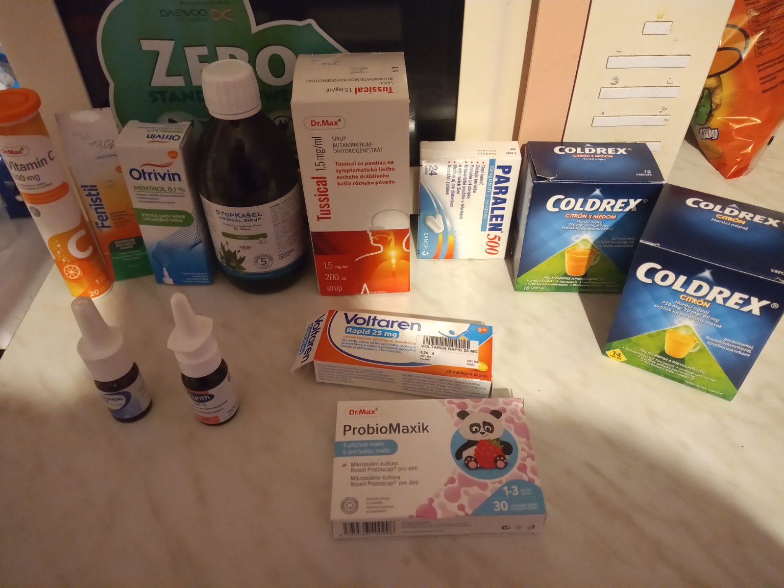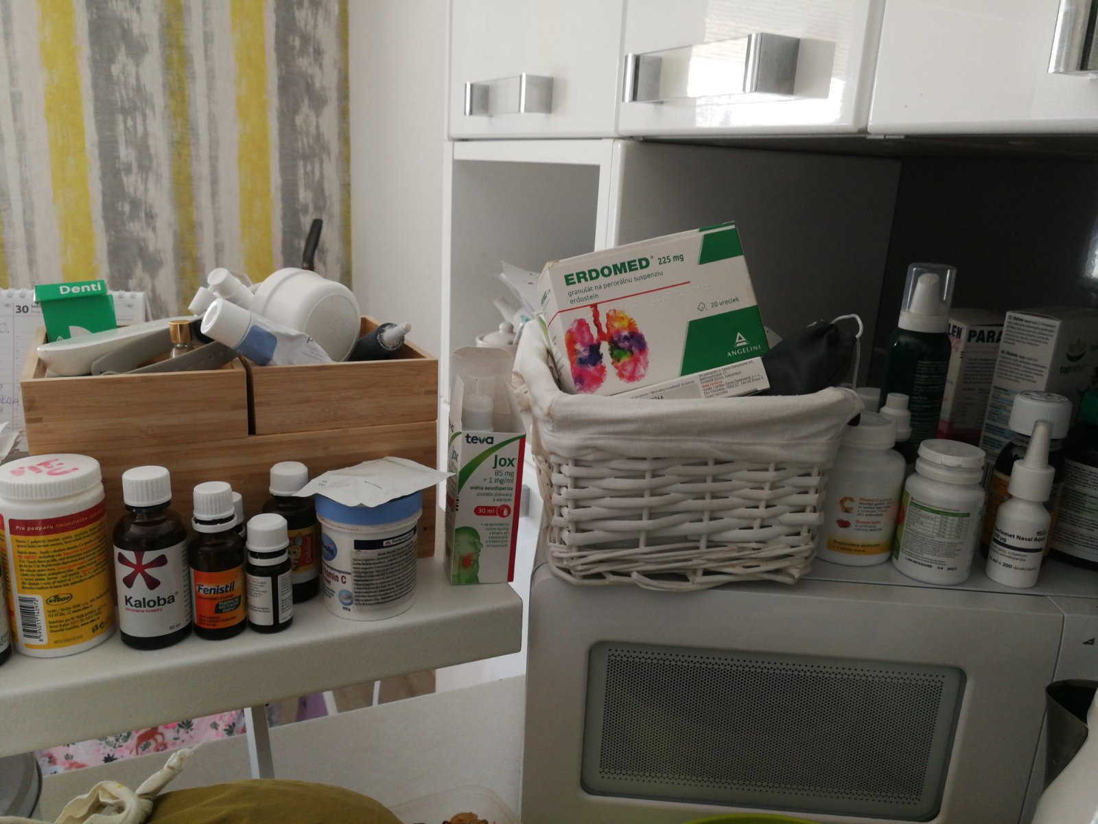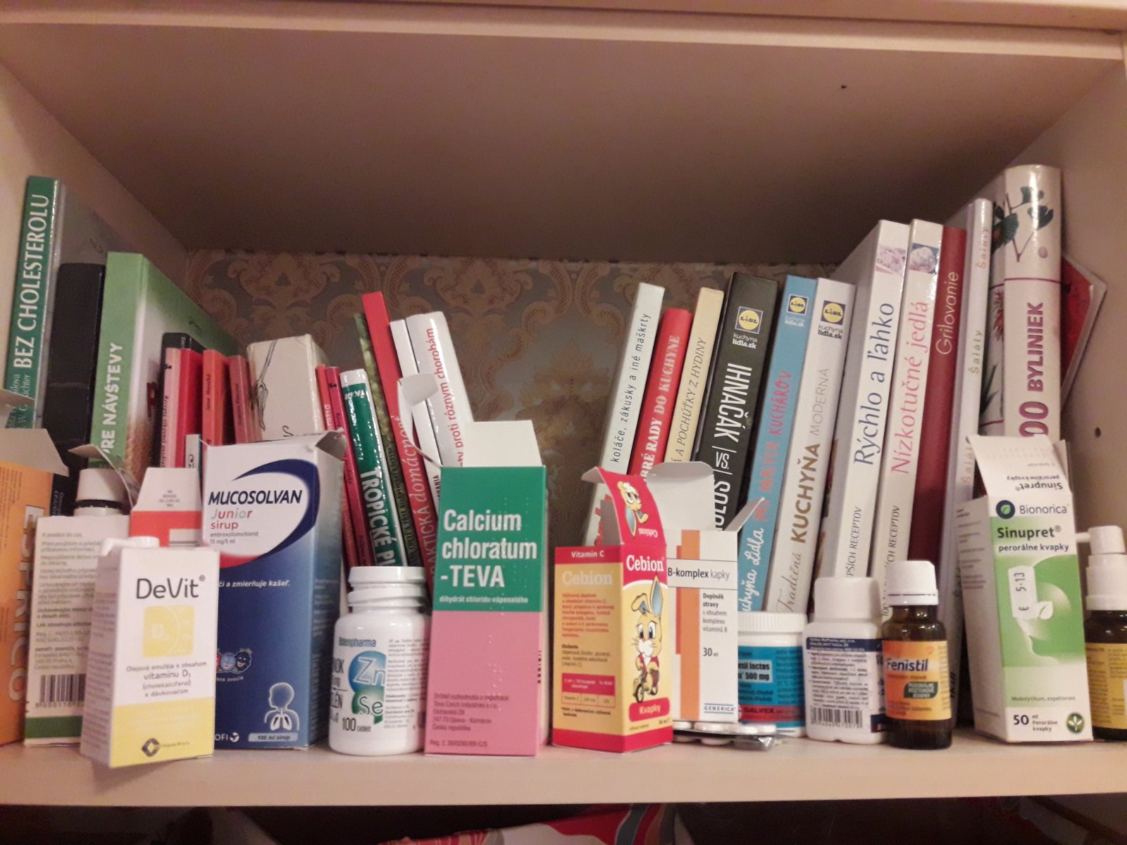 Tu je naša lekárnička,no chýba tam ešte jeden sirup,to manžel už dobral celý,potom 4r dcéra dobrala atb,jeden sprej do nosa a ešte strepfen tobolky tam chýbajú.