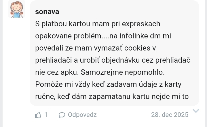 Pekný deň, neobjednavali ste dnes niekto DM s vyzdvihnutím na predajni? Nejde mi nijakým spôsobom prejsť platba. Nemali ste s tým problém ?