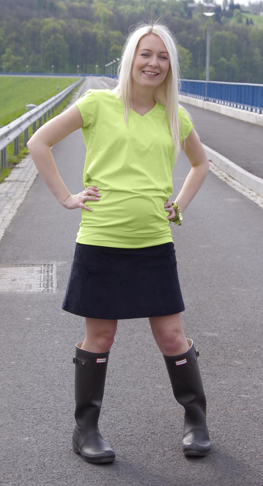 Tehotenské tričko mini rukáv, V výstrih, spodný lem, svetlo zelená v kombinácii so sukňou, menčester s elastanom, čierna