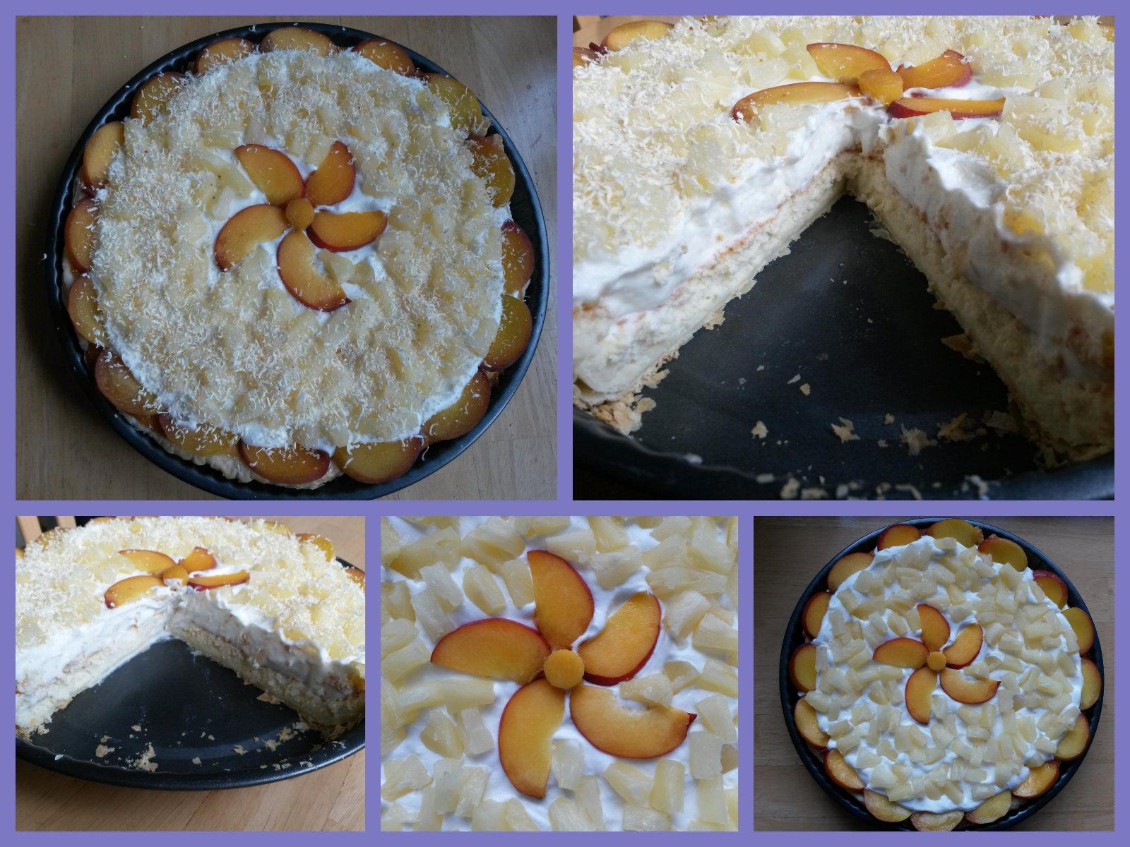 Cestom vystelieme okruhlu nízku formu ( 25 cm ) a popicháme vidličkou. Nalejeme a rozotrieme krém : smotana +mascarpone +vajíčka +cukor +muka.