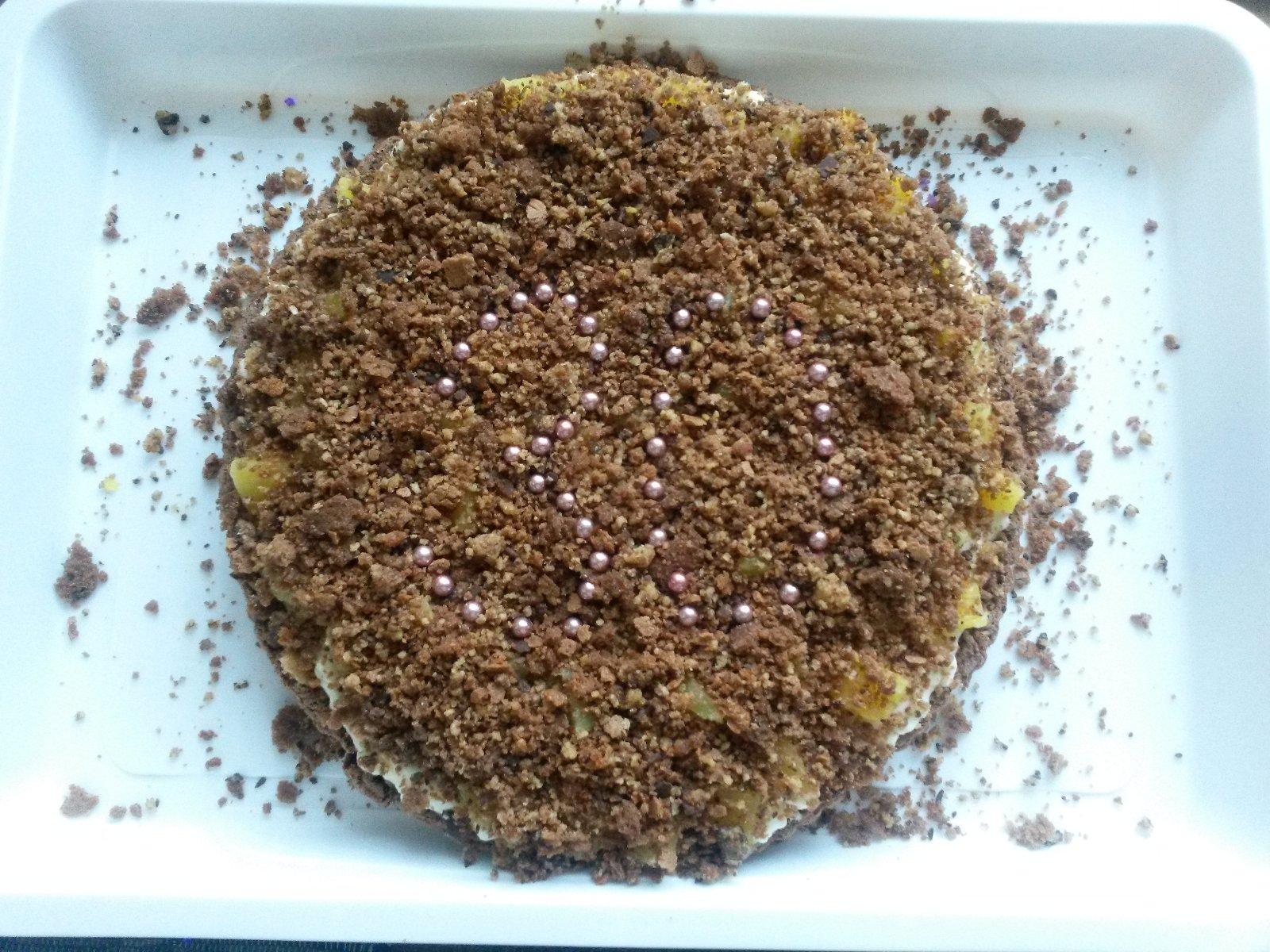 Cesto- 5 vajíčka,80g hnedého cukru,1 PL kakaa,100g horká čokoláda alebo čokoláda na varenie.Všlaháme si žltky s cukrom,pridáme rozpustenú a vychladenu čokoládu,kakaoo a nakoniec metičkou vmiešáme vyšlahaný sneh z bielkov,pečieme na 180 stupňov 15-18 minut.Krém-1 mascarpone si zmiešáme s 1 vyšľahaným pudingom OLE vanilkovým,dochutíme praš.cukrom,potrieme korpus krémom a na vrch posýpeme ananasový kompot a celý koláčik postruháme čokoládou magrot alebo kavenkou,horálkou podla chuti 🙂