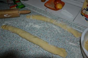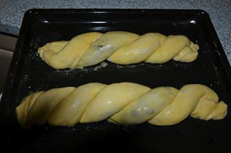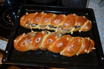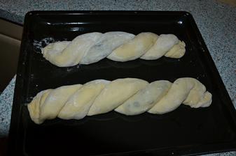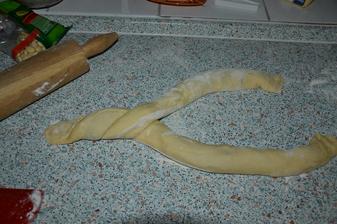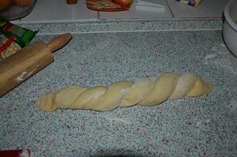 kvasok 1/2litra mlieka+3lyzice cukru+1kocka kvasnic, do misky rozbijeme 3vajcia, pridame trosku soli odhadom, 3dcl oleja - zamiesame, pridame jemne nakysnuty kvasok, do toho 1kg polohrubej muky, kludne moze byt aj hladka.. (v nemecku maju len jeden druh 🙂), 3lyzice zlaty klas.. ja som dala jeden cely (vanilkovy pudingovy prasok) a poriadne cesto vymiesime - ide to velmi lahko 🙂.. trosku poprasime vymiesene cesto mukou, zakryjeme cistou kuchynskou utierkou a zabudneme nan tak na 1,5hodiny 🙂 ja som ho dala na vlazny radiator 🙂).. ked nam zdviha utierku.. je hotovo.. ostatne v obrazkoch🙂))) inak sa to rozdeli na 8casti a robia sa z toho rohliky... vzdy 8ks.. ale mne sa s tym nechcelo paprat..tako som trosku zaimprovizovala...tiez som to rozdelila na 8casti.. ale kedze som zapletala vzdy dva kolaciky... vyslo z toho 4ks tych dvojitych 🙂 jeden bral manzel do prace.. druhy sme zjedli.. a dalsie dva isli do mraznicky 🙂) a jedia sa priebezne..aby boli vzdy cerstve 🙂)) vid foto 🙂 bolo to rychlo hotoveeeeee...