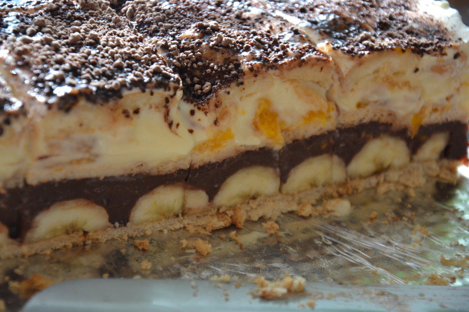 autor@ajdika bebe keksy..polovicky bananov po celej ploche,cokoladovy puding z dvoch praskov,bebe keksy,jahody a cucoriedky(mali ist mandarinky-nemala som..poliat po lyziciach stavou z kompotu,nato vanilkovy poding s jemnym tvarohom..ja som dala mascarpone;),na to okruhle piskoty..pokvapkat zvysnou stavou z kompotu..navrch dat slahacku zmiesanu s kyslou smotanou...posypat skoricou,grankom,kokosom;)ako vam chuti...cukru do vsetkeho podla potreby;) do vanilk.pudingu som davala aj vanilk.cukor a do cokoladoveho aj kakao...dobru chut