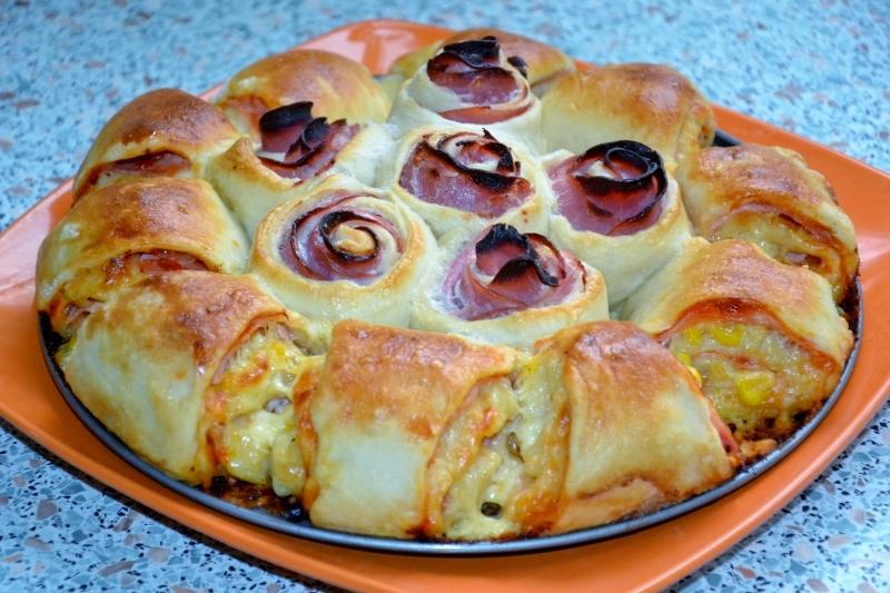 @lindush123 a je to vidno aj na foto rozbaleneho kolaca 🙂.. paradajkovy pretlak, oregano, trosku soli, sunka, syr, kukurica.. ruzicky su len so sunkou z lososa 🙂.. ale je dost slana.. viac by mi tam chutila obyc.. ale minula som na ten kolac.... tak mi uz na ne nezostala 🙂
