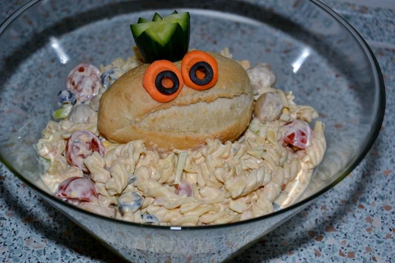 a dnes na veceru KRALOVSKY :)cestovinovy salat..(cestoviny+cherry paradajky+uhorka+vajicka+sampinony+olivy+horcica+kecup+sol+korenie+omacka:)zasa improvizacia,bo nemame doma biely jogurt ani kyslu smotanu-sladka smotana+bambino+cerstvy syr s jogurtom