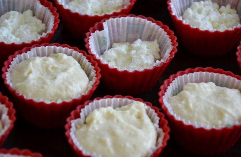 250g spaldova muka, 1/2 prašok do pečiva, vanilka, kora z 2 citronov, štava z 3 citronov, 2x vajce, stipka soli, 2 biele jogurty, 125g maslo, 1 citronovy tvaroh od rajo, zmiesat suche a mokre suroviny zvlast, ptom spojit premiesat pridat jogurt, trocha cesta do kosicka, kopcova lyzicka tvarohu a na to zas navrsit cesto,piect na 190 stupnov 25min