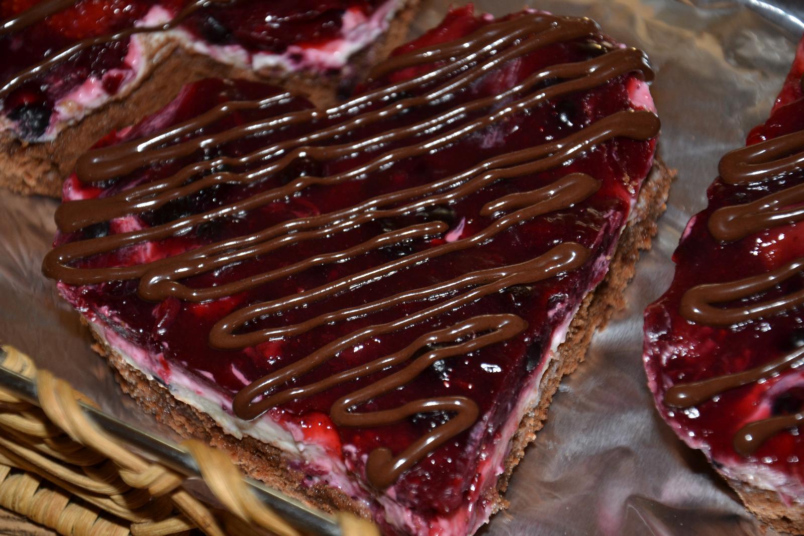 nase oblubene ... coko cesto... (100g masla, 100g kryst.cukru, 200g horkej 80%+ cokolady+4ks vajcia+4kopcovite PL hl.muky, trosku sody bikarbony), vyliat na velky plech.. na tom 2x natierkove maslo neochutene (namiesto mascarpone)+330ml 15% kysla smotana, stave z jednej limetky, kora z dvoch limetiek, prask.Cukor podla chuti, na to 500g jahod..asi 300g cucoriedok... zvarenych s troskou cukru a 1ks zlaty klas, trosku vody.. velmi mnam! navrchu coko