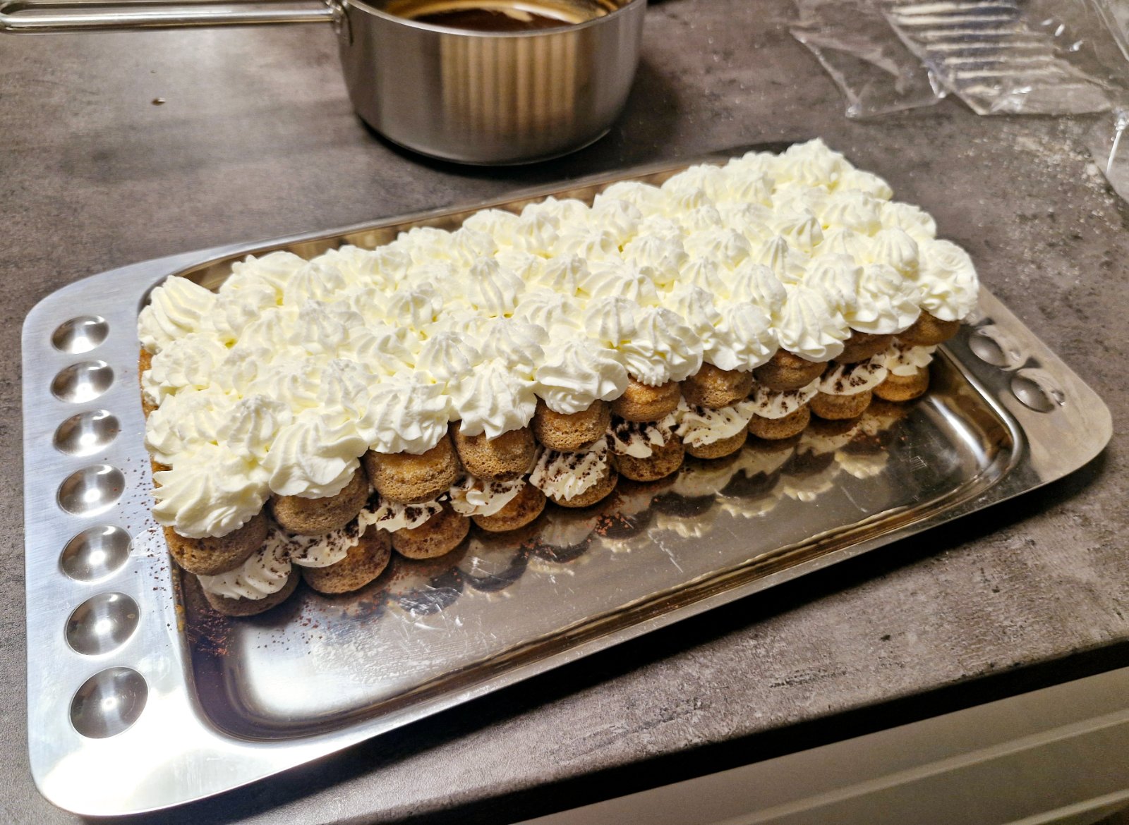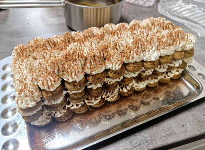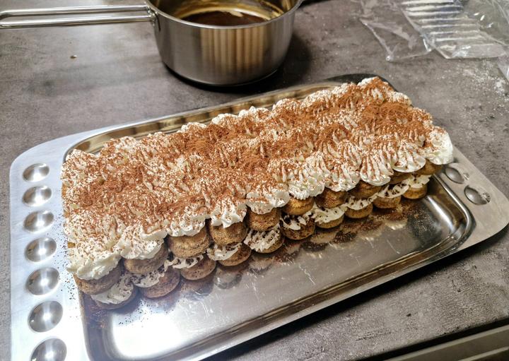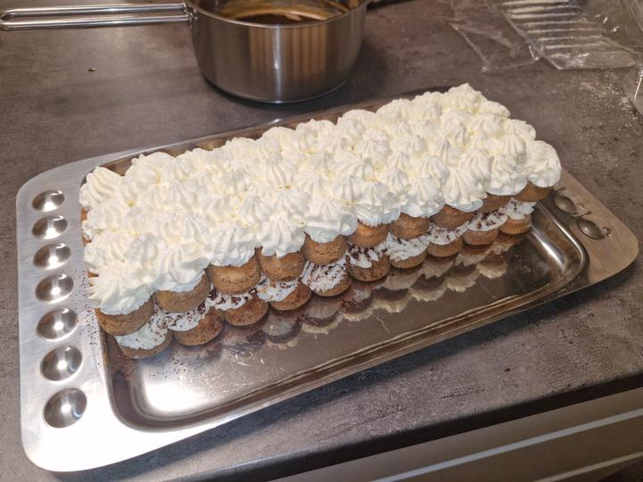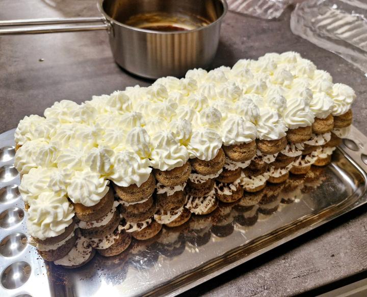 Piškóty namáčame rýchlym ponorom vo vychladnutej káve s Amarettom alebo Rumom,ukladáme do radu za seba,bude sa to potom dobre krájať,mala som krátku tácku,možte ukladať vždy na 1 poschodie celé to jedno balenie piškót..mne sa žiaľ nezmestilo;)takže ja mám až 4 poschodia,lebo mi zostalo veľa krému;)stačia bohate 3..aj kvôli stabilite;)no na moje prekvapenie to do rána udržalo a zostalo pekne pokope;)
