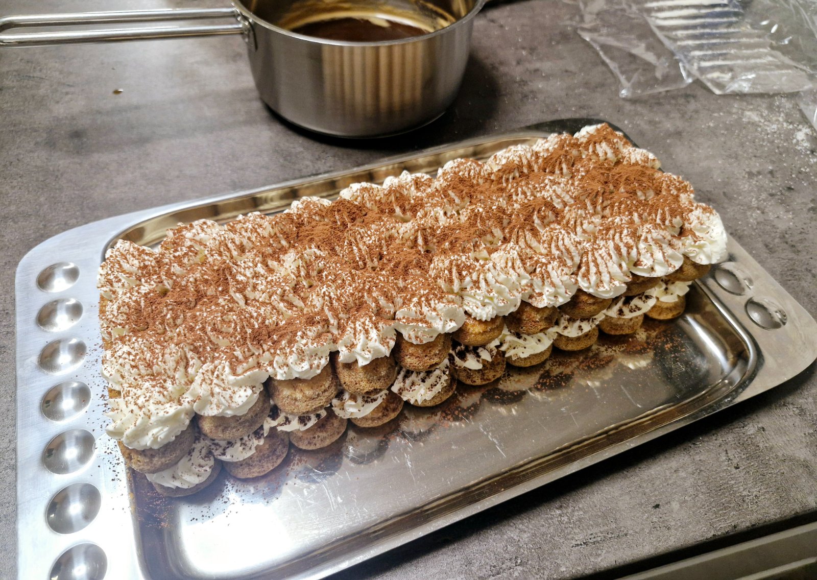 Zdobiacou špičkou navrstvíme krém,posypeme cez sitko kakaom,zasa vrstvíme piškóty,krém,kakao...kým krém neminieme;)