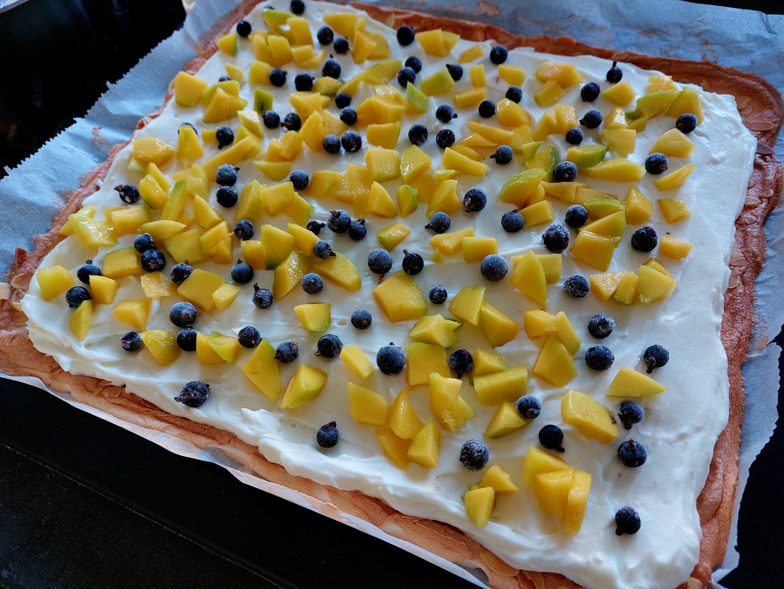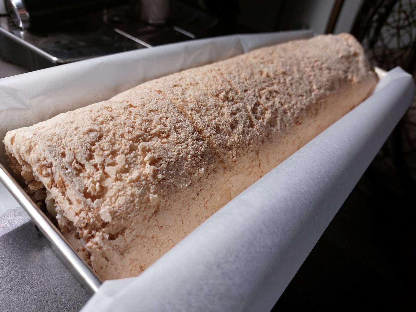 Po zavinutí dáme roládu ešte aspoň na 2 hodiny stuhnúť do chladničky, ja ju zvyknem preložiť v papieri na pečenie do hranatej úzkej formy,aby mi pekne držala tvar. Pomocou papiera ju z formy veľmi ľahko zasa vytiahnem a pohodlne na doske nakrájam. Je veľmi lahodná,lepšia ako pavlowka👌