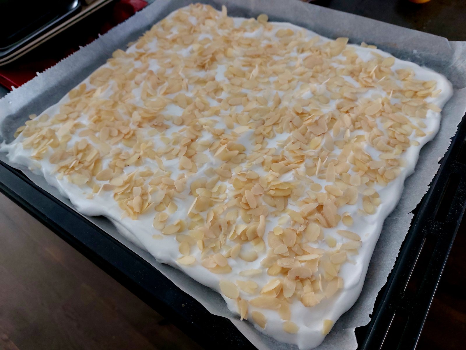 Oddelíme bielka od žĺtkov. Z bielkov šľaháme tuhý sneh tak,že do zmesi počas šľahania postupne pridávame citrónovú šťavu a cukor, až kým nám nevznikne tuhá,lesklá hmota,ktorú potom rozotrieme rovnomerne na papier na pečenie. Posypeme mandľami alebo posekanými orechmi a dáme piecť do rúry na 25 minút pri teplote 180 stupňov. Po upečení budú mať oriešky na povrchu úžasnú chuť. Upečené bielky necháme vychladnúť.