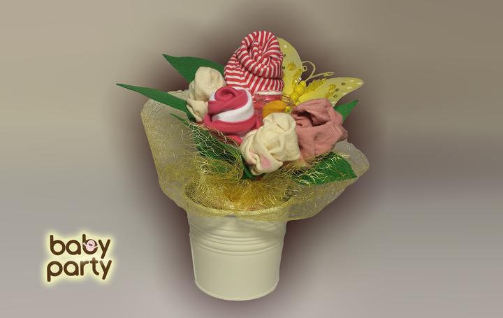 Baby Party kytica. Zloženie: dievčenské body, podbradník, dva páry ponožiek, dudel a ozdoby v jarných farbách.