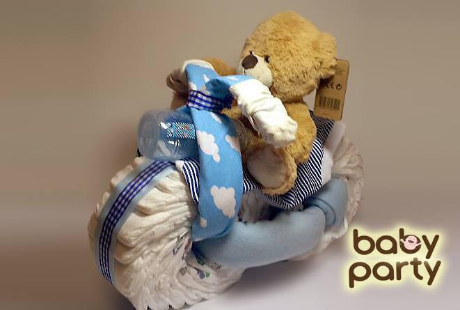 Maco - motorkár. Je zložený iba z vecí, ktoré dieťa potrebuje: 36 plienok (Happy, veľkosť 2), dve deky, chlapčenské body, jeden pár ponožiek, fľaša pre kojenca a plyšový maco.