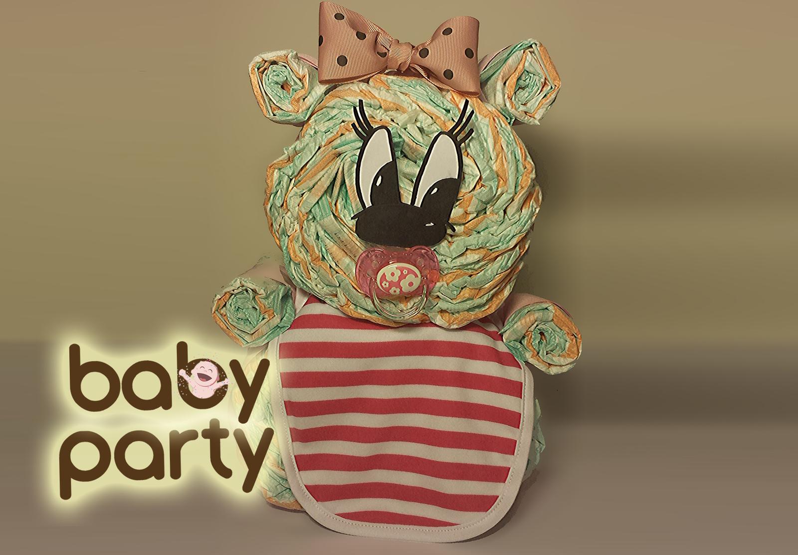 Macík z plienok pre dievčatko. Skladá sa z 30 plienok (Pampers Sleep & Play - veľkosť 4), podbradník, cumlík.