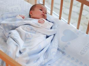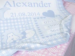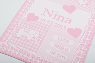 Deka s menom, dátumom a časom narodenia, mierami bábätka.