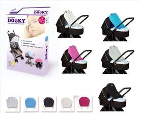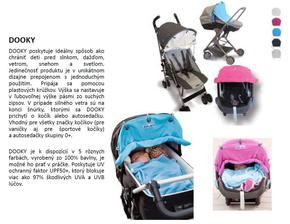 DOOKY poskytuje ideálny spôsob ako chrániť deti pred slnkom, dažďom, vetrom, snehom a svetlom. Jedinečnosť produktu je v unikátnom dizajne prepojenom s jednoduchým použitím. Pripája sa pomocou plastových krúžkov. Výška sa nastavuje v ľubovoľnej výške pásmi zo suchých zipsov. V prípade silného vetra sú na konci šnúrky, ktorými sa DOOKY prichytí o kočík alebo autosedačku. Vhodný pre všetky značky kočíkov (pre vaničky aj pre športové kočíky) a autosedačky skupiny 0+.