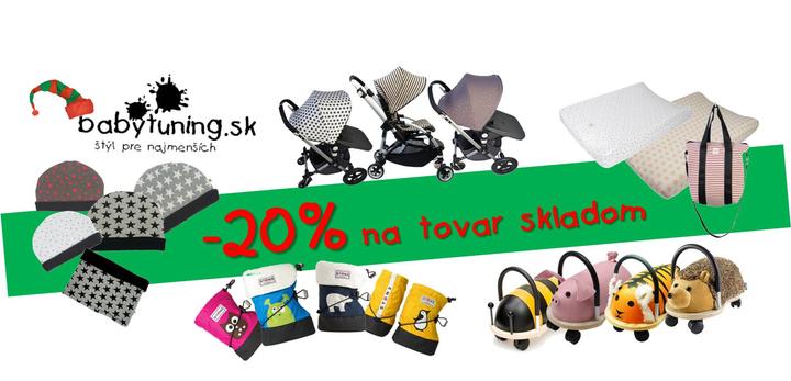 My vám k tomu pribalíme skvelé ceny! Zľavu -20% na všetok tovar skladom - na STONZ topánočky S/M/L/XL, striešky na Bugaboo, poťahy na prebaľovacie podložky, odrážadlá Original Wheely Bug a iné!!!