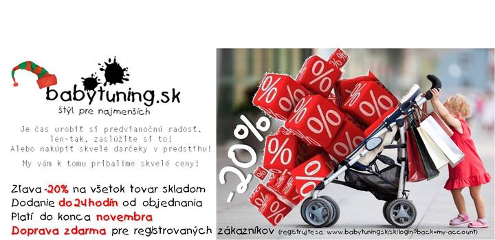 Priatelia, je čas urobiť si predvianočnú radosť, len-tak, zaslúžite si to! Alebo nakúpiť skvelé darčeky v predstihu! My vám k tomu pribalíme skvelé ceny! Zľavu -20% na všetok tovar skladom - na STONZ topánočky S/M/L/XL, striešky na Bugaboo, poťahy na prebaľovacie podložky, odrážadlá Original Wheely Bug a iné!!! Len počas novembra a do vypredania zásob! Navyše, registrovaní zákazníci majú dopravu zdarma! Registrujte sa: www.babytuning.sk/sk/login?back=my-account