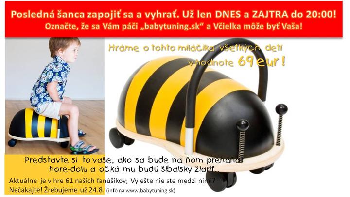 V hre je veľký model Wheely Bug Včielka v hodnote 69 eur! Mnohonásobne ocenená austrálska hračka rozvíjajúca motoriku, orientáciu a koordináciu. Zamilujete si ju Vy aj Vaše dieťatko!